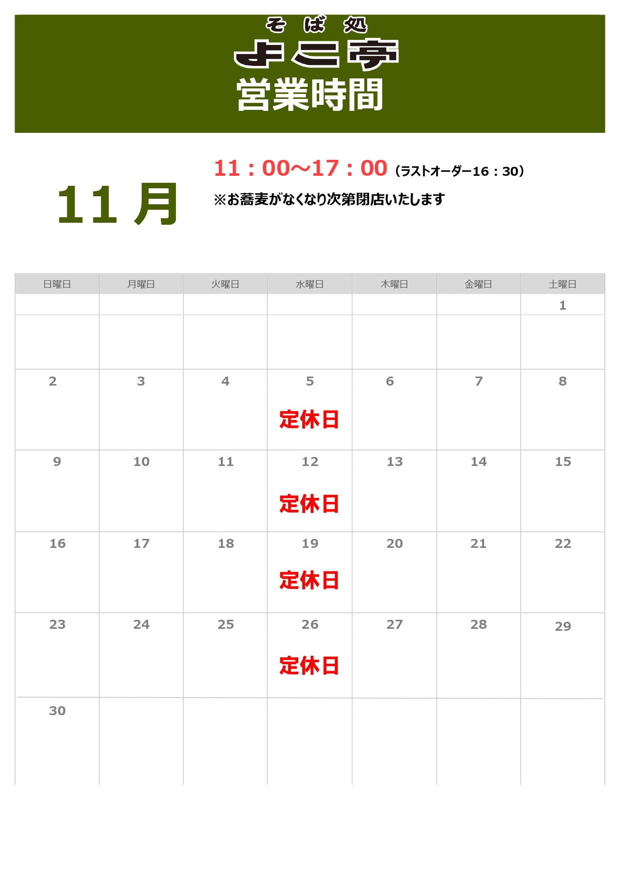 11月の営業日の知らせ 投稿公開日:2025年10月20日 投稿カテゴリー:お知らせ いつもよこ亭をご利用いただきまして誠にありがとうございます。 2025年11月の営業時間のお知らせです。皆さまのご来店を心よりお待ちしております。 おすすめ 12月の営業時間について 2024年12月22日 2023年8月の営業時間について 2023年8月4日 12月の営業時間について 2023年11月28日