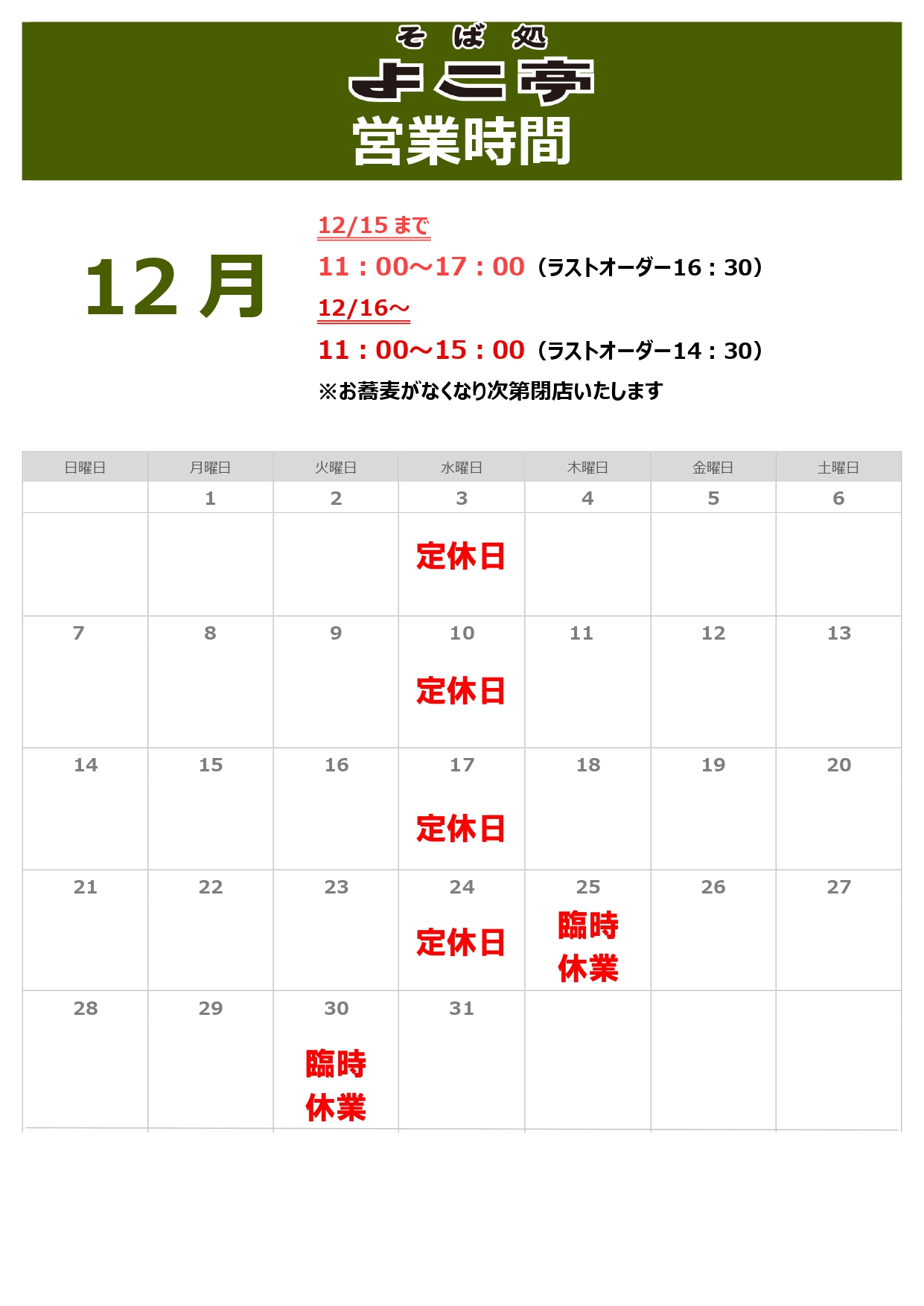 12月の営業日の知らせ 投稿公開日:2025年11月18日 投稿カテゴリー:お知らせ いつもよこ亭をご利用いただきまして誠にありがとうございます。 2025年12月の営業時間のお知らせです。皆さまのご来店を心よりお待ちしております。 おすすめ 2022年8月8日 新そば提供開始のお知らせ 2024年10月8日 お蕎麦屋さんの「お弁当」販売中! 2023年6月9日