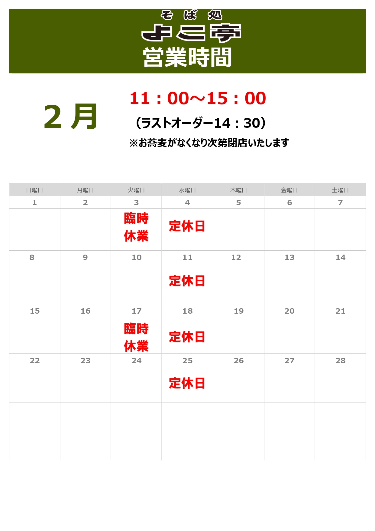 2月営業日のお知らせ 投稿公開日:2026年1月19日 投稿カテゴリー:お知らせ いつもよこ亭をご利用いただきまして誠にありがとうございます。 2026年2月の営業時間のお知らせです。皆さまのご来店を心よりお待ちしております。 おすすめ 12月の営業時間について 2023年11月28日 3月3日~3月7日 臨時休業のご案内 2025年1月30日 12月の営業時間について 2024年12月22日